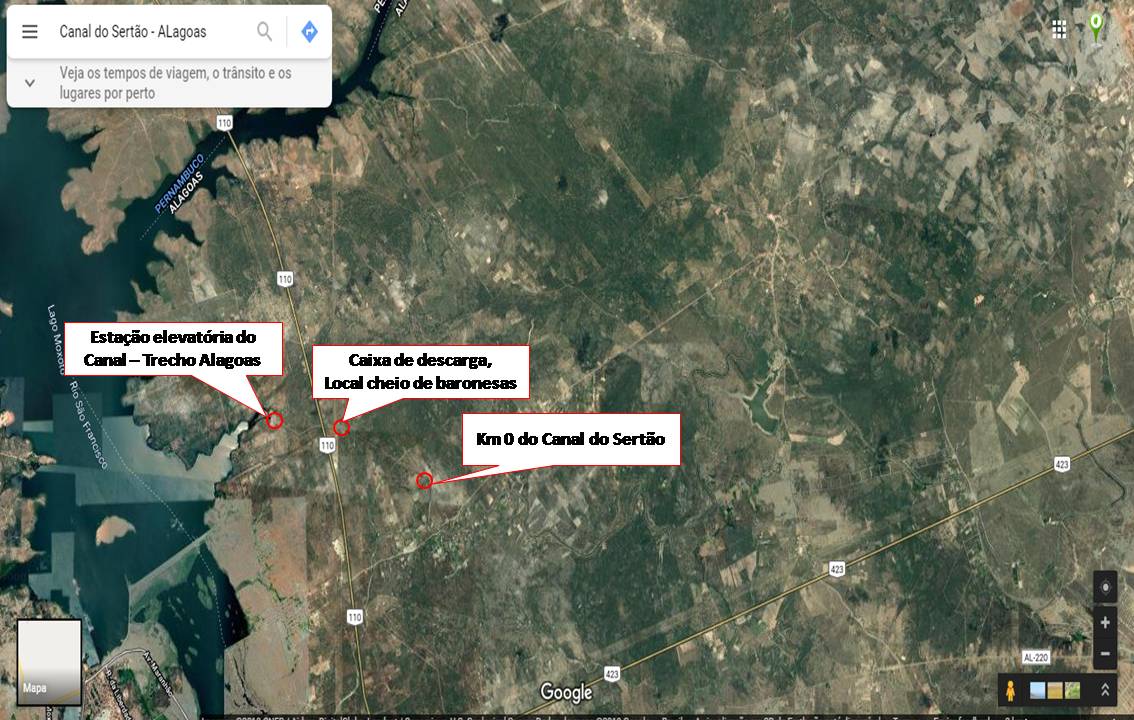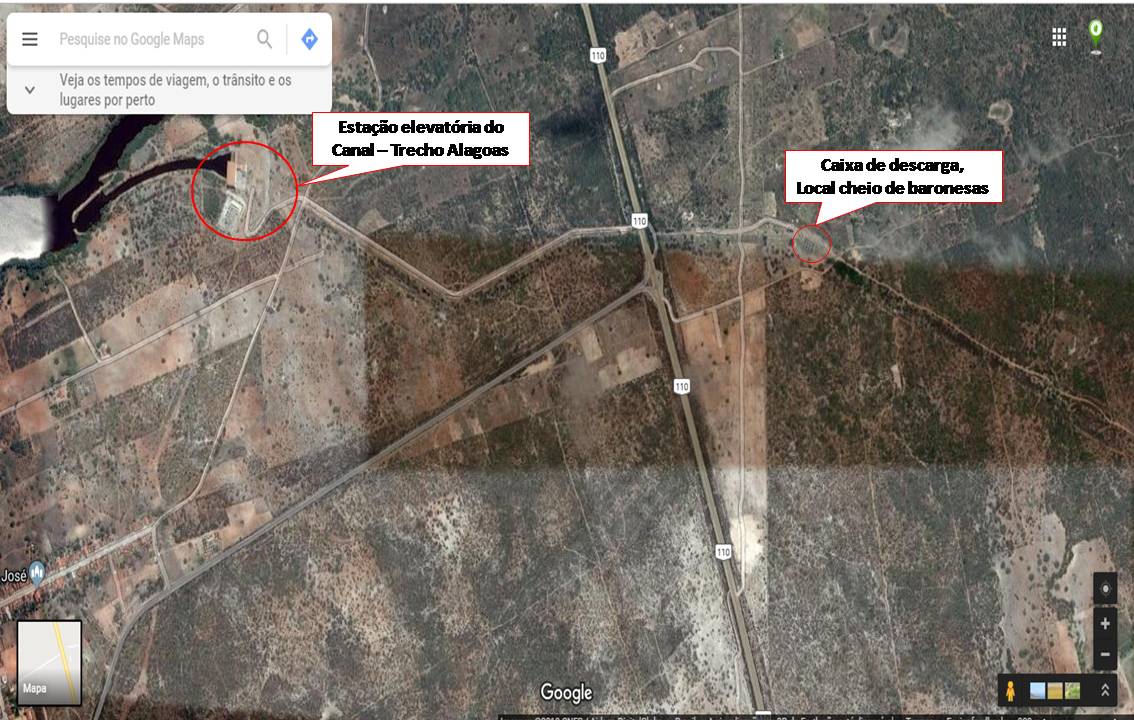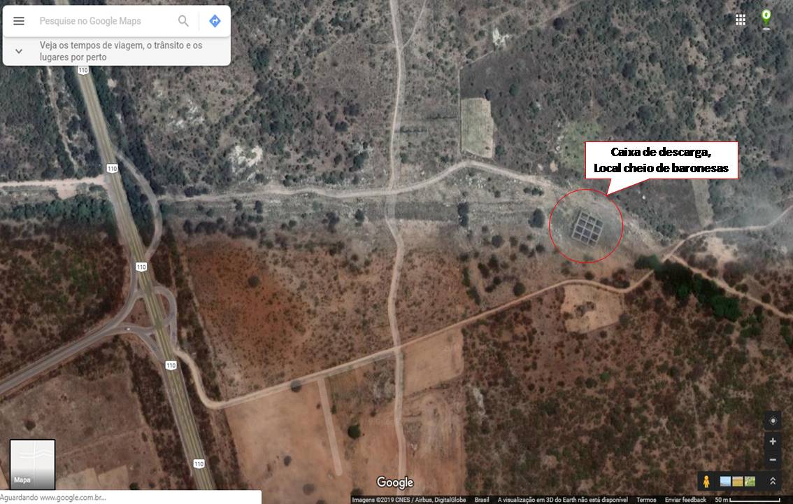 O local da caixa de descarga é aberto, as baronesas ficam expostas ao sol, o que favorece o crescimento delas. O local tem apenas uma cerca de arame caído e fica na margem de uma estrada vicinal, que pode ser acessado a partir da BR 110 que liga Alagoas a Pernambuco. Essa região faz parte do povoado Valha-me Deus. Veja abaixo, fotos do google maps com esquema explicando o local, fotos das baronesas e os vídeos que fiz.