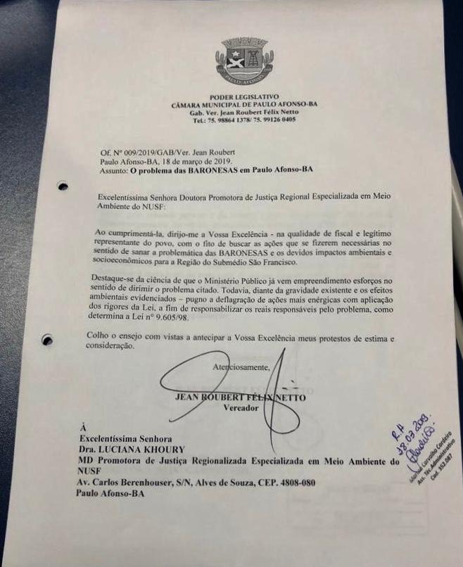 Cumprindo mais uma vez o seu papel de fiscal, o vereador Jean Roubert emitiu ofício à Promotora de Justiça Regional Especializada em Meio Ambiente do NUSF, Dra Luciana Khoury, no sentido de buscar as ações necessárias para sanar a problemática das baronesas e os devidos impactos ambientais e socioeconômicos para a região do Sub médio São Francisco.