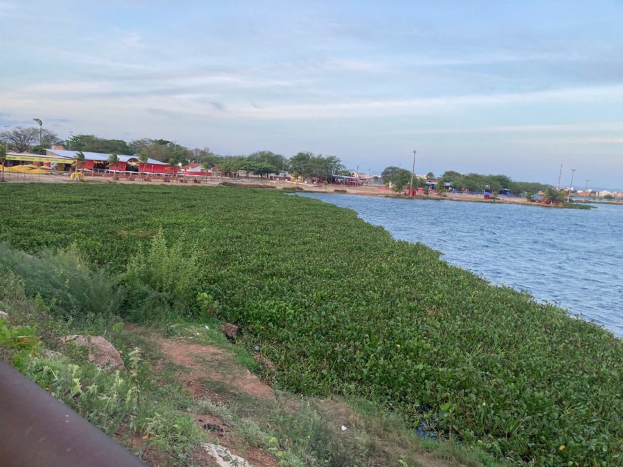 Um trecho da Prainha de Paulo Afonso às  margens do Rio São Francisco recebeu mais uma vez uma pequena concentração da vegetação verde com flores roxas. Essas plantas são as Baronesas que se alimentam da matéria orgânica dos esgotos.