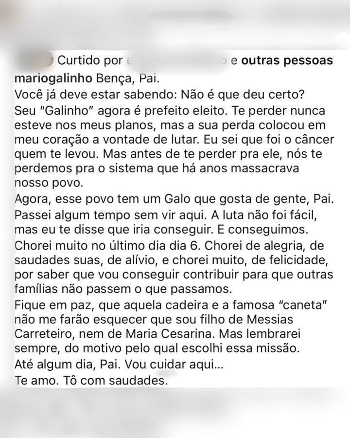 Diante do túmulo, Galinho comunicou sua conquista com carinho: “Você já deve estar sabendo: não é que deu certo? Seu ‘Galinho’ agora é prefeito eleito.” Ele relembrou que, apesar de nunca ter planejado perder o pai, essa perda despertou nele o desejo de lutar por mudanças na cidade. “Te perder nunca esteve nos meus planos, mas a sua perda colocou em meu coração a vontade de lutar”, escreveu.