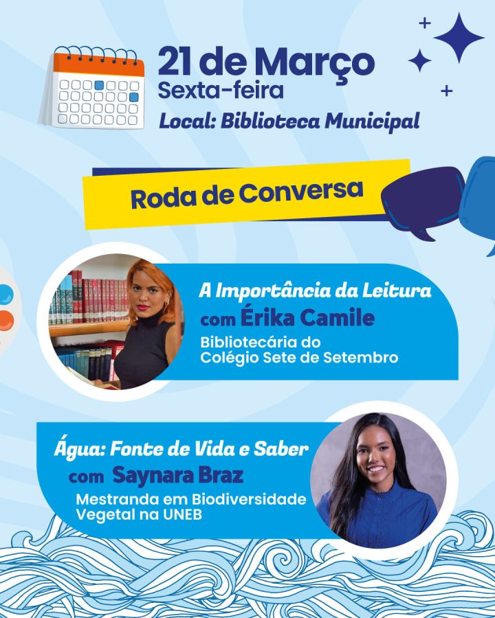 - 14h: Roda de Conversa: Água, Fonte de Vida e Saber – com Saynara Braz, mestranda em Biodiversidade Vegetal na UNEB