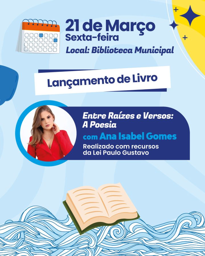- 16h: Lançamento do livro “Entre Raízes e Versos: A Poesia” – de Ana Isabel Gomes, realizado com recurso da Lei Paulo Gustavo