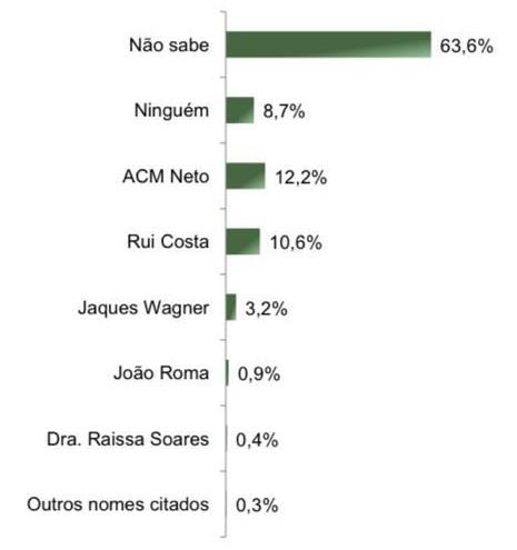 Na pesquisa espontânea, em que não são apresentados nomes como opções aos eleitores, a maior parcela não sabe responder (63,6%). Entre os nomes citados, o de ACM Neto soma o maior percentual: 12,2%.