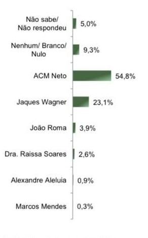 O governador Rui Costa, que está no segundo mandato, foi citado por 10,6%. Já Jaques Wagner por 3,2%.