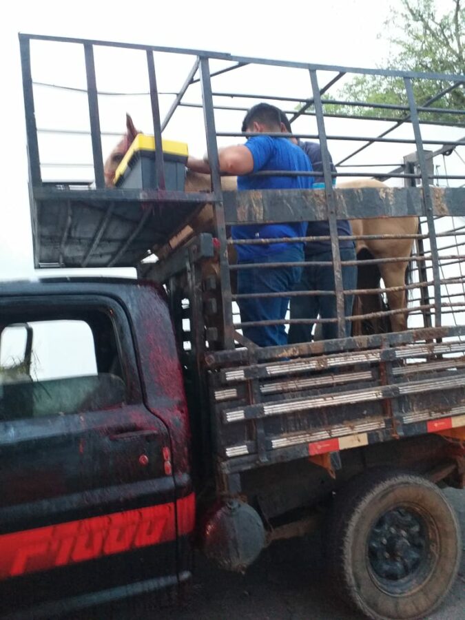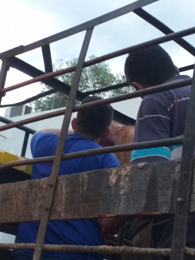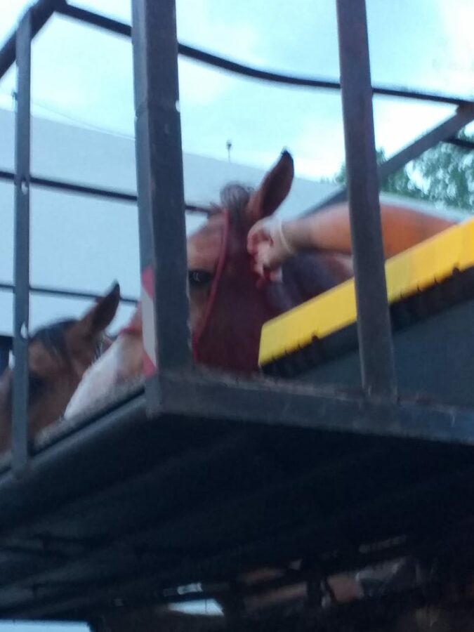Por volta das 17:30, uma pessoa ligou informando que havia um cavalo com a cabeça presa na grade de uma caminhonete.
