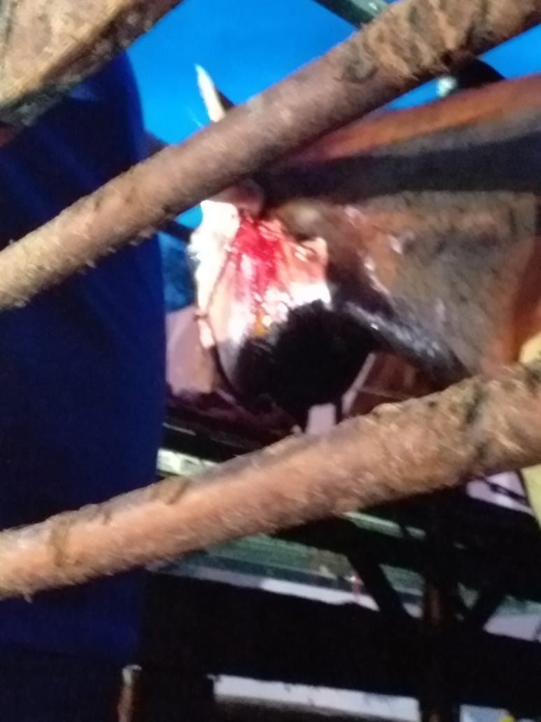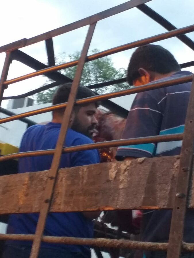 Ao chegar no local, os bombeiros encontraram o animal bastante ferido. “Chegando ao local o animal sangrava bastante após prender sua cabeça na grade do veículo que o conduzia. O animal levou um corte profundo no pescoço lesionando uma artéria importante o que dificultou bastante a hemostasia que naquele momento estava sendo feito por um veterinário”, informou a corporação.