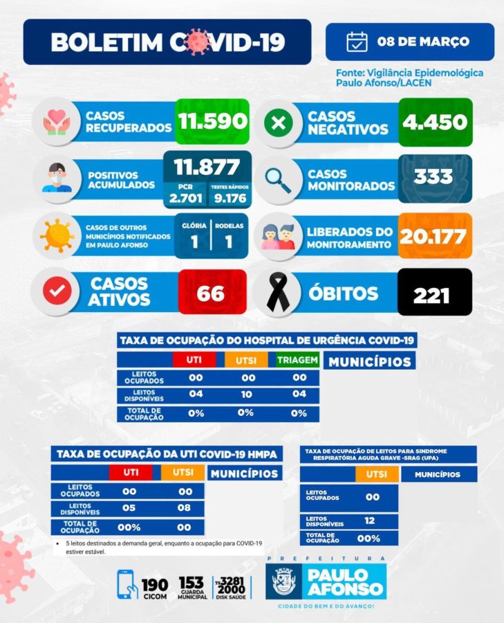 O número de casos ativos da Covid-19 caiu para 66 nesta terça-feira (8) em Paulo Afonso, Bahia, de acordo com boletim divulgado pela Secretaria de Saúde do Município. Outra boa notícia é que tanto os leitos clínicos quanto os de UTI seguem com taxa de ocupação zerada.