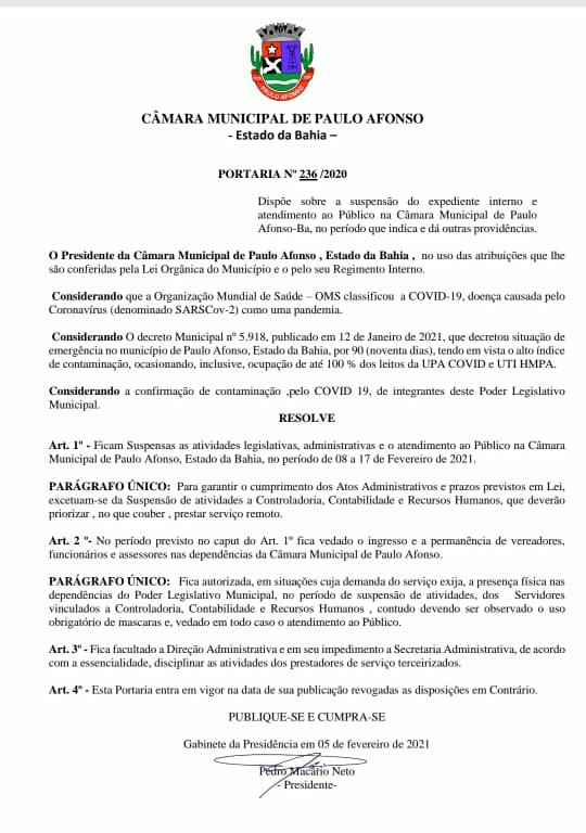 A Câmara Municipal de Paulo Afonso suspendeu as atividades a partir desta segunda-feira (8) até o dia 17 de fevereiro, como prevenção à Covid-19. Semana passada, o presidente da Casa, vereador Pedro Macário (DEM) testou positivo para o novo coronavírus.