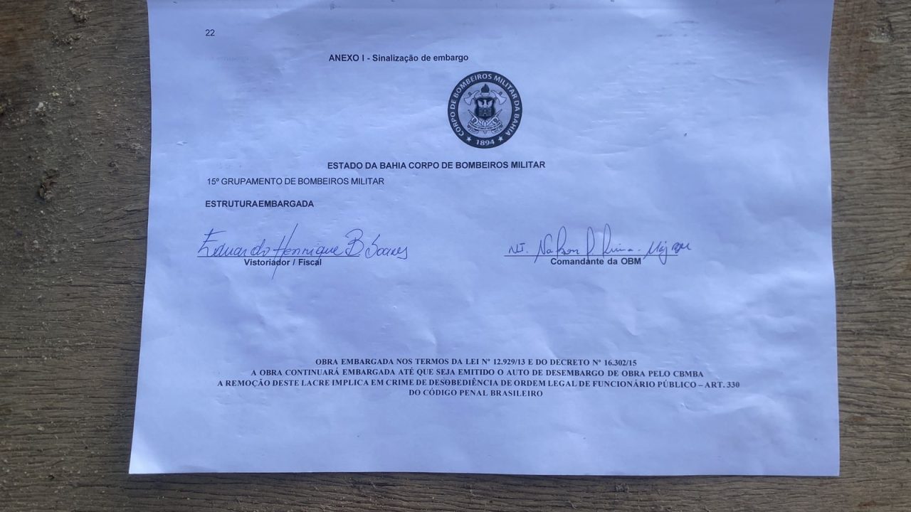 A decisão de embargo ocorreu devido à pré-montagem da estrutura sem a aprovação do Projeto Técnico e sem a Autorização Para Execução, em desacordo com a Instrução Técnica n°02/CBMBA. “Essa irregularidade compromete a segurança e, por isso, está sujeita a embargo, conforme determinações legais”, explicou o 15° BBM em nota oficial.