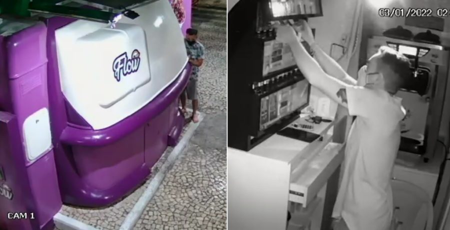 Vídeos divulgados nas redes sociais mostram a ação de um homem arrombando um quiosque na madrugada desta segunda-feira (03/01/2022), por volta das 02h15.