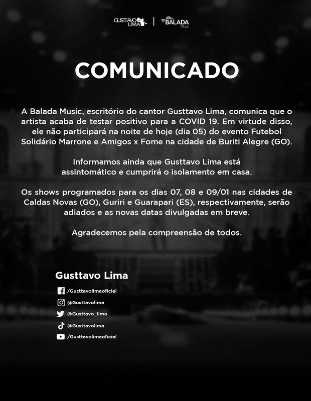 “A Balada Music, escritório do cantor Gusttavo Lima, comunica que o artista acaba de testar positivo para a COVID 19. Em virtude disso, ele não participará na noite de hoje (dia 05) do evento Futebol Solidário Marrone e Amigos x Fome na cidade de Buriti Alegre (GO). Informamos ainda que Gusttavo Lima está assintomático e cumprirá o isolamento em casa”, diz o comunicado.