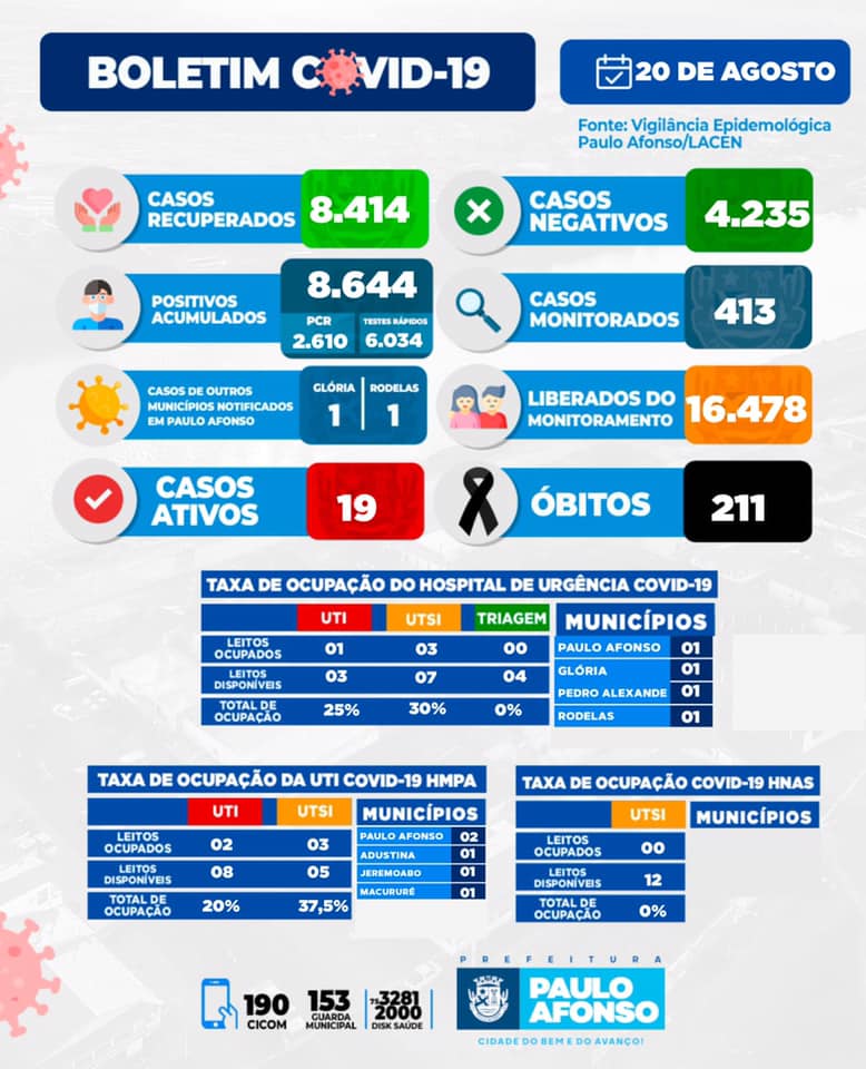 Nas últimas 24 horas, Paulo Afonso confirmou 4 novas contaminações pelo novo coronavírus e 11 pacientes recuperados da infecção. No total, desde o início da pandemia, o município já registrou 8.644 casos confirmados, 8.414 recuperados e 211 óbitos pela doença.