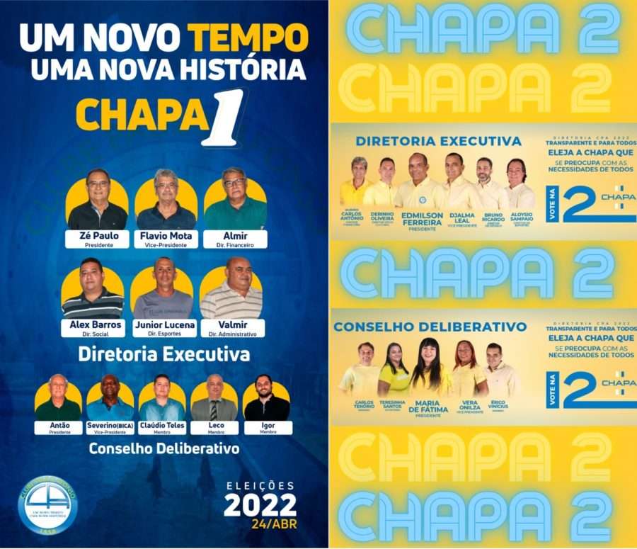 Já a chapa 2 “Transparente e para todos” que tem o apoio da atual diretoria e do presidente Francisco Araújo (Chico) é encabeçada por Edmilson Ferreira tendo como vice Djalma Leal, Bruno Ricardo (diretor secretário), Derinho Oliveira (diretor sócio cultural), Alemão (diretor financeiro e Aloysio Sampaio (direotr de esportes).