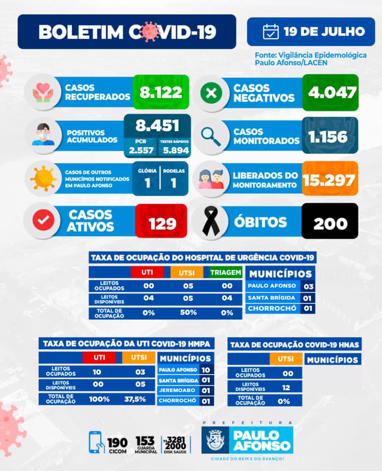 Com mais dois óbitos registrado nesta segunda-feira (19), chegou a 200 o número de mortos por Covid-19 no município de Paulo Afonso desde o começo da pandemia. O primeiro caso foi confirmado há cerca de um ano e três meses, no fim de abril de 2020. Em 27 de maio do mesmo ano, houve a confirmação da primeira morte pela doença no município.