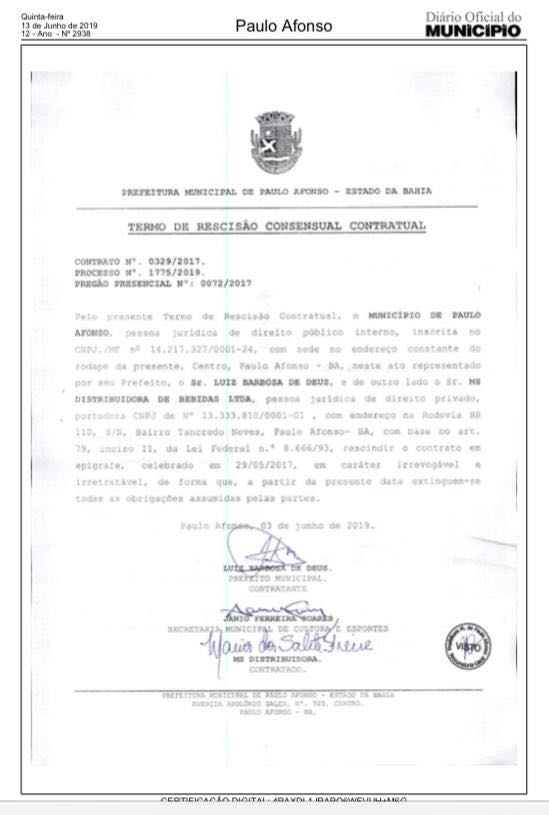 De acordo com nota da prefeitura enviada ao portal PA4.COM.BR a iniciativa da revogação contratual partiu da empresa MS Distribuidora: “Houve a solicitação por parte da Schin, de forma amigável, da revogação do contrato. Em consideração a parceria firmada com a empresa durante todos esses anos, a Prefeitura de Paulo Afonso aceitou o pedido sem nenhum ônus para a Schin, tendo em vista que o contrato se estendia até 2020.”, informou a prefeitura.
