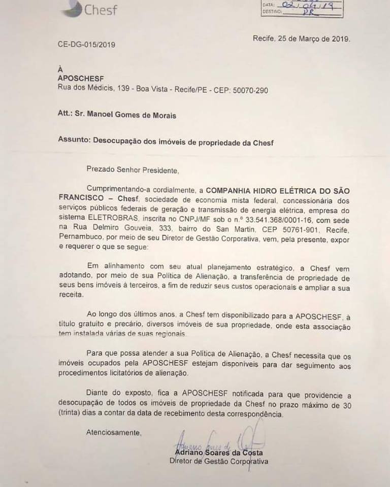 Chesf é criticada após notificar Aposchesf a desocupar todos os imóveis: “Agressão aos milhares de aposentados”