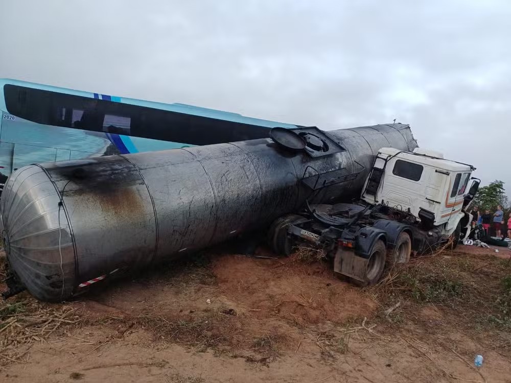 Fotos mostram que os três veículos ficaram totalmente destruídos após o acidente. Bancos dos ônibus foram parar no meio da pista e o tanque da carreta, que estava vazio, se descolou da estrutura.