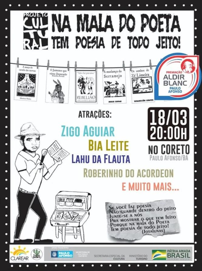 Nesta sexta-feira (18), o Circuito Cultural, promovido pela Secretaria de Cultura e Esporte tem continuidade com a apresentação do projeto Na Mala do Poeta. O evento, que acontece a partir das 20h no Coreto, é a segunda apresentação das entidades culturais contempladas na Lei Aldir Blanc.