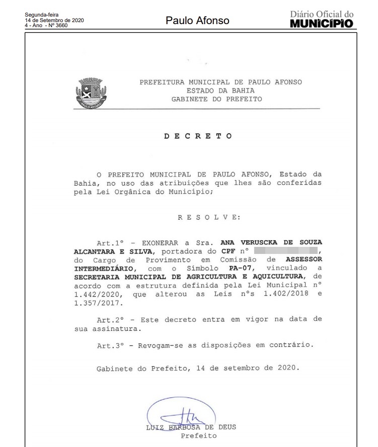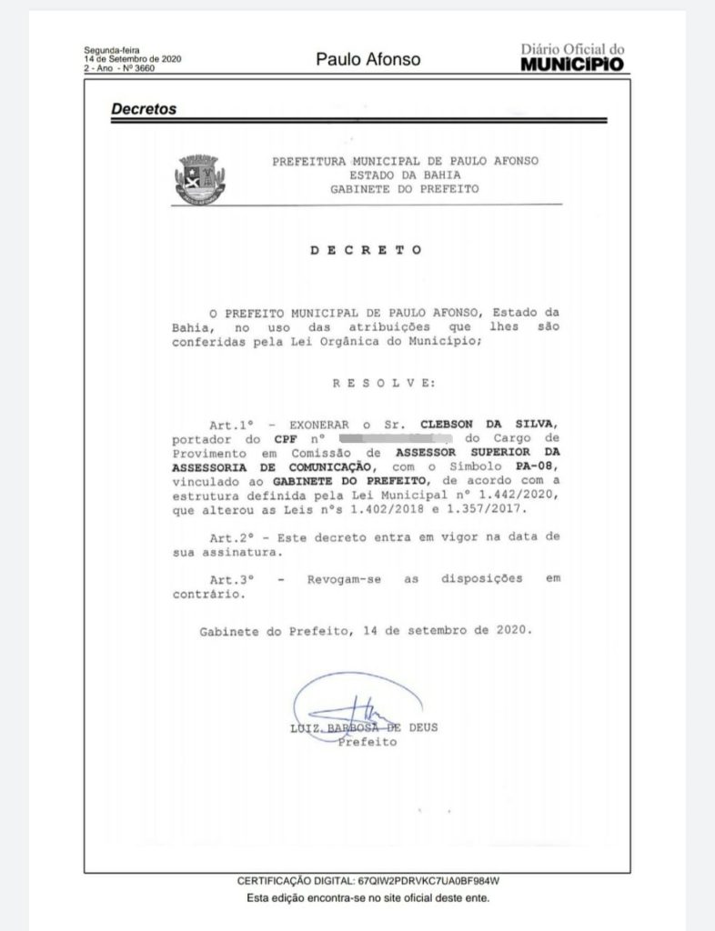 Após ficar pouco tempo à frente da Assessoria de Comunicação da Prefeitura Municipal de Paulo Afonso, Clebson da Silva (Moreno), foi exonerado da função na tarde desta segunda-feira, 14, segundo publicação do Diário Oficial do município.