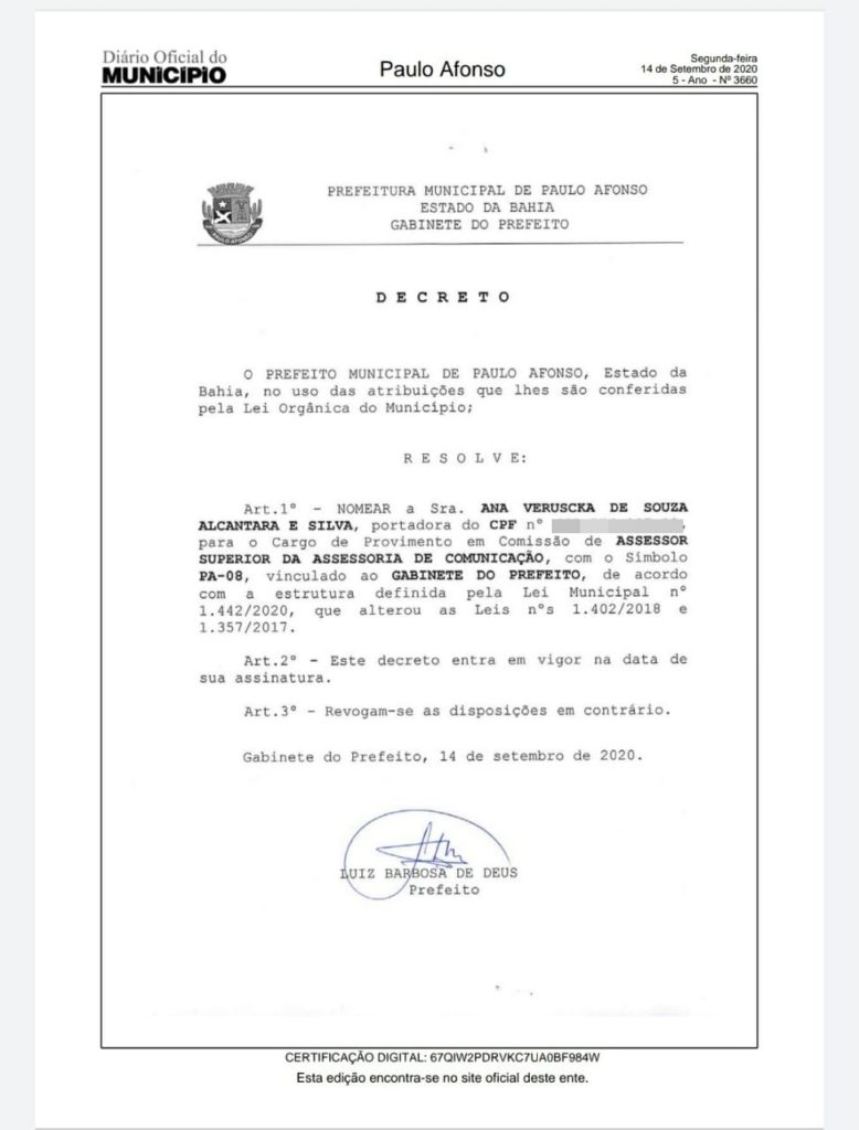 A Comunicação da prefeitura será comandada agora pela jornalista Veruscka Alcântara que já atua no órgão, porém, estava nomeada na Secretaria de Agricultura ocupando o cargo de Assessora Intermediária. O decreto com a nomeação da nova chefe da imprensa municipal também foi publicado na tarde de ontem.