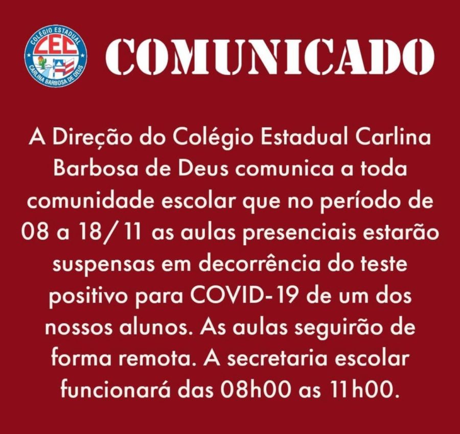 O Colégio Estadual Carlina Babosa de Deus, em Paulo Afonso suspendeu as aulas presenciais após um estudante testar positivo para Covid-19. Nesta segunda-feira (8), o boletim epidemiológico do município registrou mais uma nova infecção pela doença e 21 casos ativos.