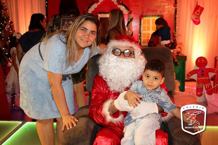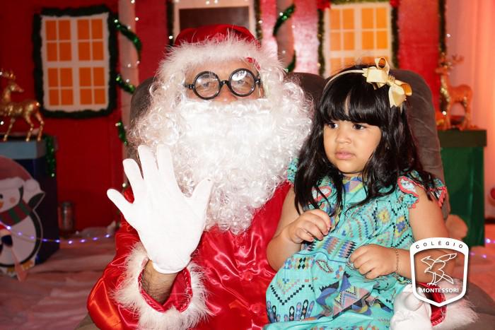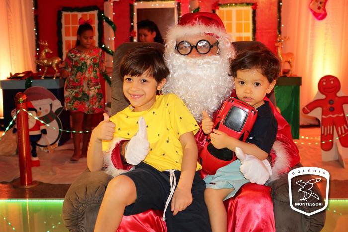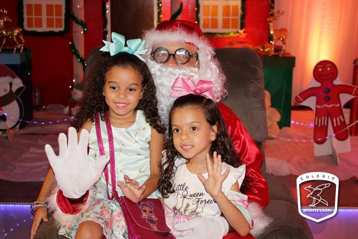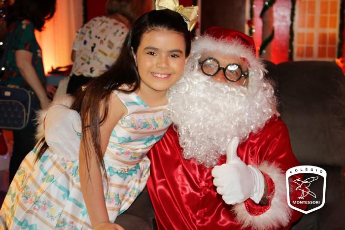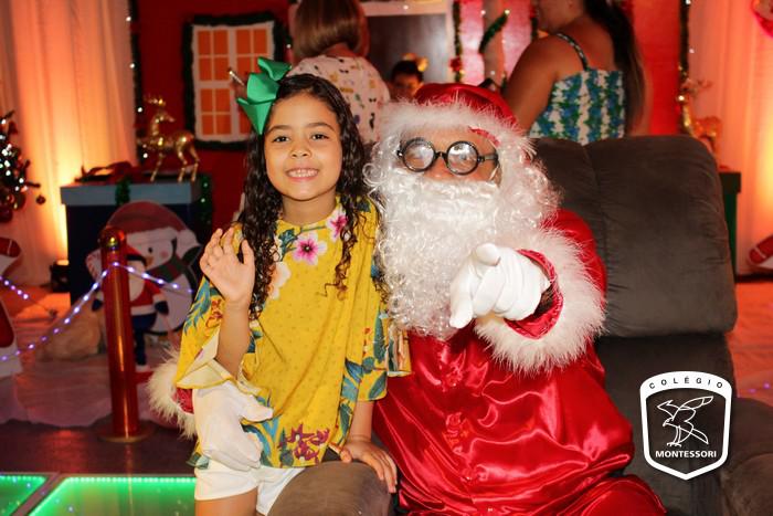 Na entrada do Colégio, aquela calorosa recepção ao som dos acordes da Orquestra Montessori para fazer a acolhida das crianças em um cenário montado para ocasião, um espetáculo de cores, luzes e brilho. E lá estava Papai Noel aguardando os alunos em sua poltrona para aquele abraço e a tradicional foto.
