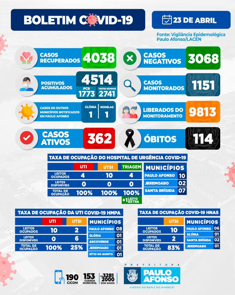 “Isso é muito grave e reforça o compromisso de todos em fazer o seu papel, evitando aglomerações, usando máscara e se cuidando, preservando a si, os familiares e a comunidade como um todo.”, alertou a prefeitura de Paulo Afonso em seu boletim.
