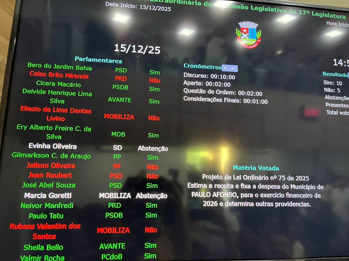 A Câmara Municipal de Paulo Afonso aprovou nesta segunda-feira (15 de dezembro) a Lei Orçamentária Anual (LOA) de 2026, em uma sessão marcada por discussões intensas, manifestações do público e mudanças relevantes no cenário político local. O projeto foi aprovado por 10 votos a favor, cinco contra e duas abstenções.