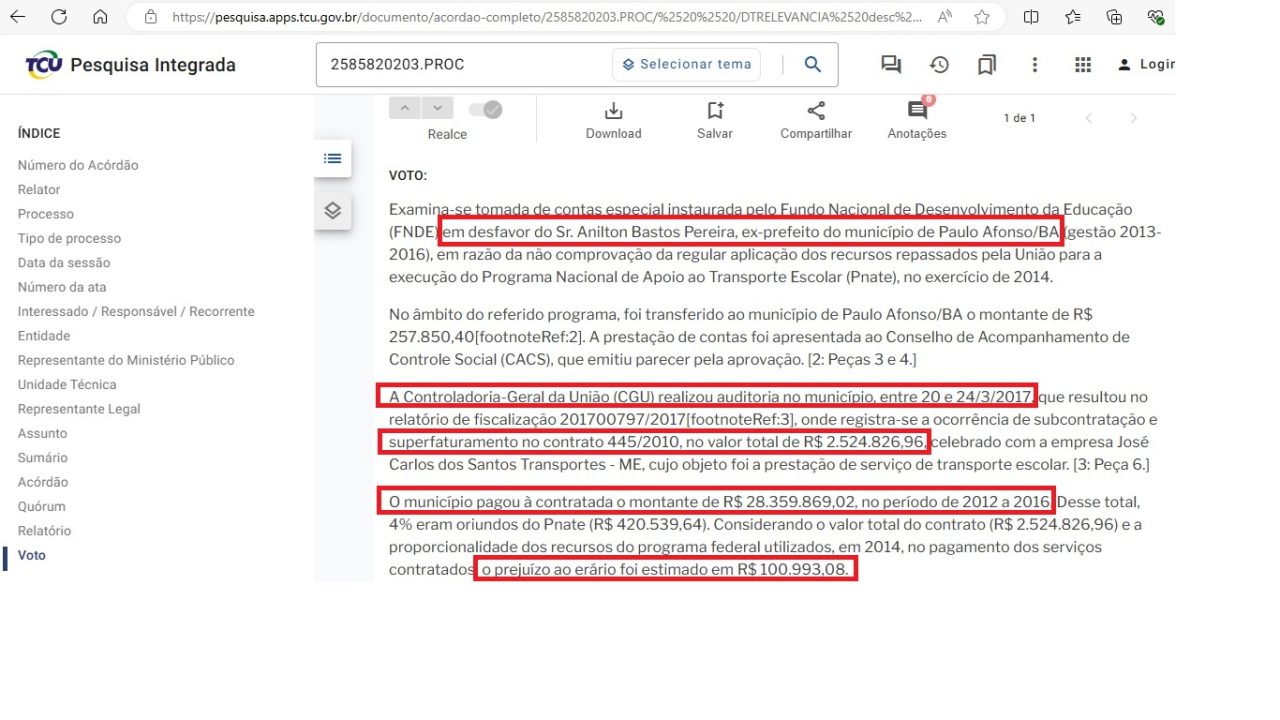 De fato, conforme o TCU, durante a gestão de Anilton, o município recebeu R$ 257.850,40 do Pnate. A prestação de contas foi inicialmente aprovada pelo Conselho de Acompanhamento de Controle Social (CACS). No entanto, uma auditoria realizada pela Controladoria-Geral da União (CGU) entre 20 e 24 de março de 2017 revelou graves irregularidades, incluindo subcontratação e superfaturamento no contrato nº 445/2010 com a empresa José Carlos dos Santos Transportes – ME, no valor total de R$ 2.524.826,96. O município pagou à contratada R$ 28.359.869,02 entre 2012 e 2016, dos quais 4% eram provenientes do Pnate (R$ 420.539,64). Estima-se que o prejuízo ao erário, decorrente do superfaturamento e uso inadequado dos recursos federais em 2014, foi de R$ 100.993,08.