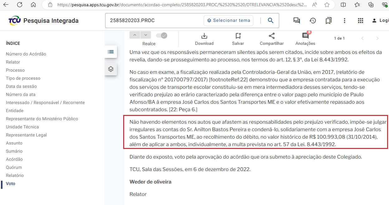 O TCU determinou que Anilton Bastos Pereira, em solidariedade com a empresa José Carlos dos Santos Transportes – ME, deve ressarcir o valor de R$ 100.993,08 ao erário e pagar multas individuais, conforme previsto na legislação.