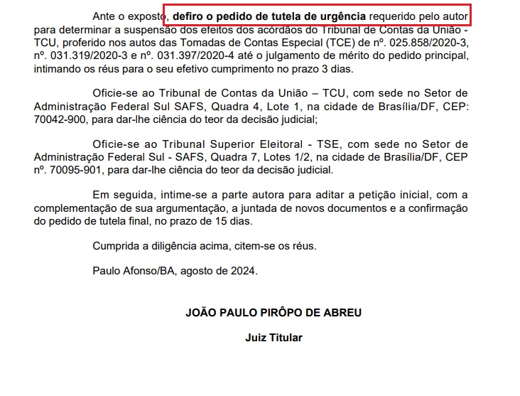 A Justiça Federal intimou o Tribunal de Contas da União (TCU) e o Tribunal Superior Eleitoral (TSE) sobre a decisão e concedeu um prazo de 15 dias para que Anilton adite sua petição inicial e complemente sua argumentação.