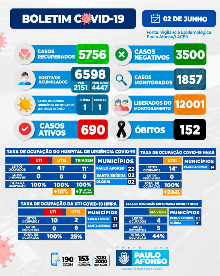 O Boletim Informativo desta quarta-feira (2), registrou mais 5 mortes por covid-19 no município de Paulo Afonso. Com isso, o número de óbitos causados pela doença passou dos 150, já são 152 vidas perdidas desde o início da pandemia.