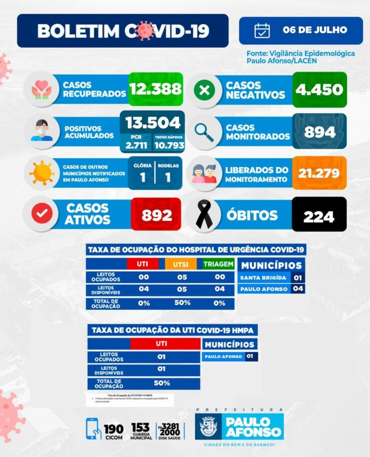 O Boletim Informativo desta quarta-feira (6) traz o registro de mais 230 casos positivos e infelizmente um óbito por covid-19 nas últimas 24 horas em Paulo Afonso, somando 224 óbitos pela doença ao longo da pandemia.