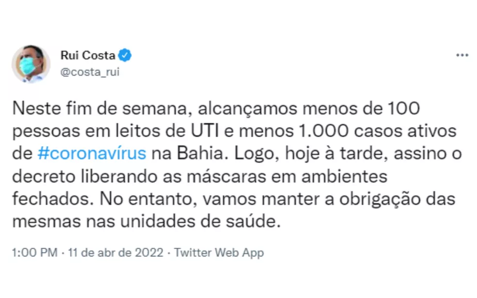 O governador da Bahia, Rui Costa, anunciou, nesta segunda-feira (11), a liberação do uso de máscaras em locais fechados, em todo o estado. Segundo o governador, o item seguirá obrigatório apenas em unidades de saúde.