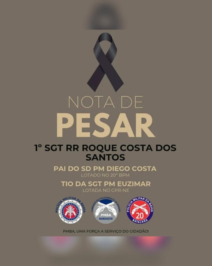 O Comandante do 20º Batalhão de Polícia Militar emitiu uma nota de pesar pelo falecimento do Sargento da Reserva Remunerada Roque Costa dos Santos. Ele é pai do Soldado PM Diego Costa, que atua no 20º BPM, e tio da Sargento PM Euzimar, lotada no CPR-NE.