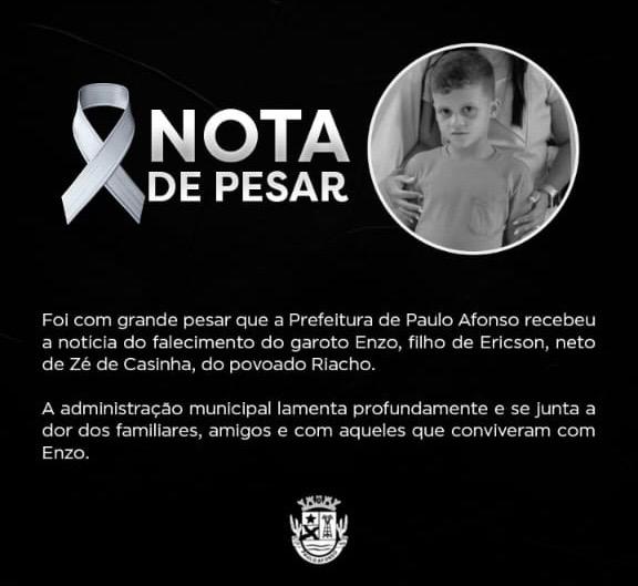 A Prefeitura de Paulo Afonso divulgou uma nota de pesar nesta quarta-feira pelo falecimento do garoto Enzo, morador do povoado Riacho, zona rural do município. Enzo era filho de Ericson e neto de Zé de Casinha, figuras conhecidas na comunidade.