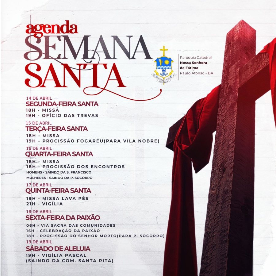 A Semana Santa é um período de profunda reflexão e celebração para a comunidade católica. Em Paulo Afonso, Bahia, a Paróquia Catedral Nossa Senhora de Fátima preparou uma programação especial para este ano, com diversas atividades litúrgicas que começaram neste Domingo de Ramos, 13 de abril, e se estendem até o Sábado de Aleluia, em 19 de abril de 2025.