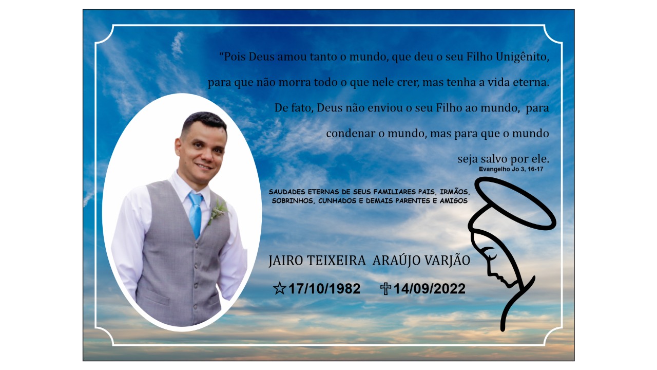 Convidamos a todos para a Missa de Sétimo Dia de Jairo Teixeira Araújo Varjão. A missa será realizada nesta terça-feira, 20 de setembro, às 19 horas, na Igreja Nossa Senhora de Fátima, localizada na Avenida Getúlio Vargas, no Centro de Paulo Afonso, Bahia.