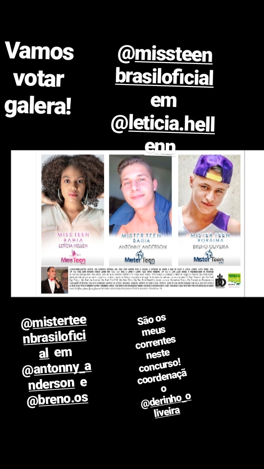 Veja também através dos instagrans – @derinho_oliveira, @missteenbrasiloficial @misterteenbrasiloficial @antonny_anderson, @leticia.hellenn