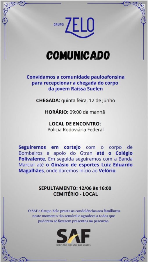 A família enlutada convida toda a população pauloafonsina para recepcionar o corpo da jovem Raíssa Suelen, que chegará à cidade na quinta-feira, 12 de junho, às 9h da manhã.