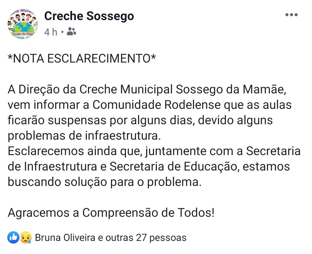 Esta obra foi construída com recursos do FNDE (Fundo Nacional de Desenvolvimento da Educação). O Secretário de Obras e Infraestrutura Gabriel Maniçoba e o Engenheiro Civil da Prefeitura Eng. Jonatas Marques solicitaram que a diretora suspendesse imediatamente as atividades da creche por uma semana por motivo de segurança, e nesse período realizar um laudo detalhado das possíveis irregularidades e riscos da obra com o objetivo de tomar as providências necessárias.