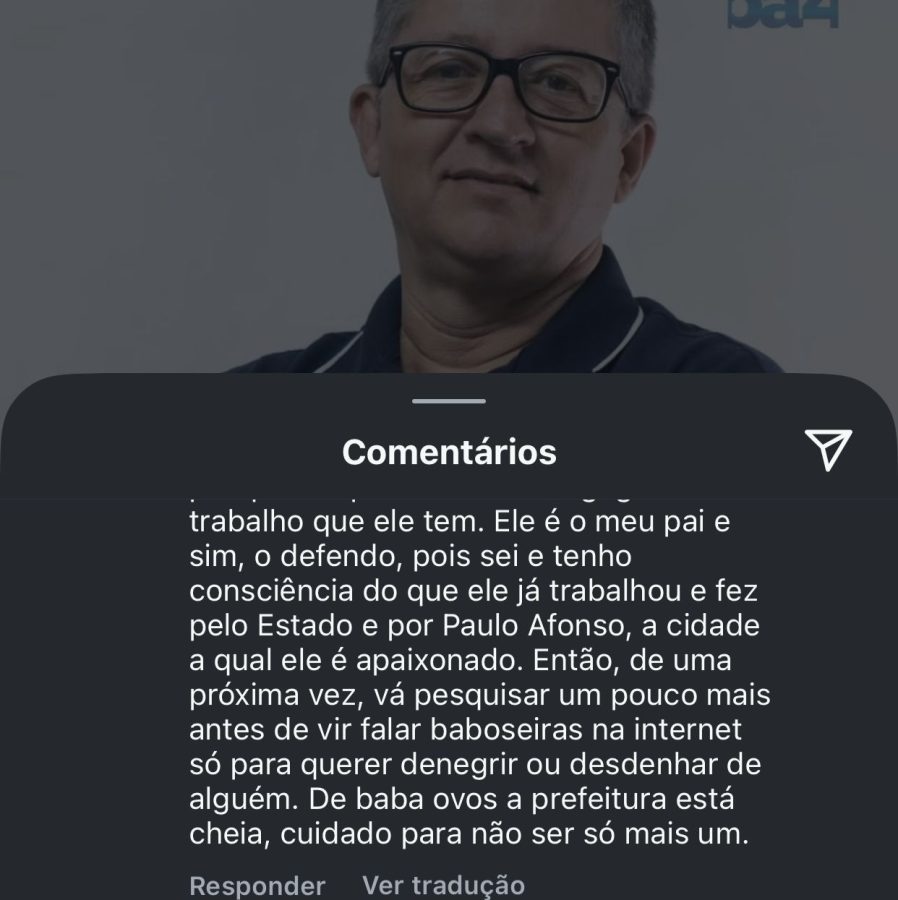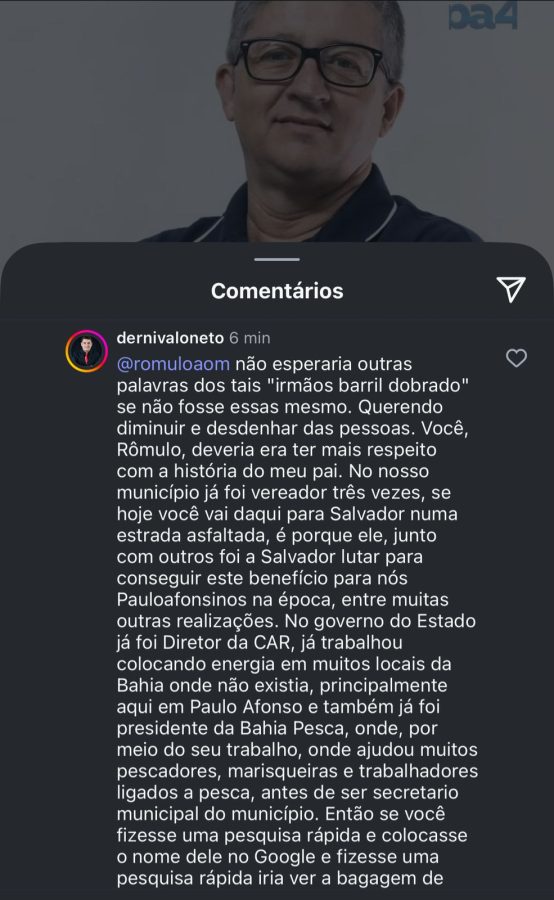 Em resposta, o filho do político – Valzinho Oliveira, bacharel em Direito – rebateu com veemência as críticas de Rômulo. Em seu comentário, ele destacou a trajetória política do pai, mencionando que Val Oliveira foi vereador por três mandatos e participou ativamente de importantes projetos, como a luta para a pavimentação de estradas rumo a Salvador e a implementação de benefícios para a população local. Valzinho concluiu seu pronunciamento pedindo respeito à história e à bagagem de trabalho de seu pai, chamando a atenção para a necessidade de se evitar “baboseiras” e desdenhos infundados.