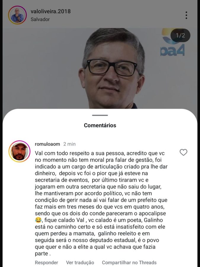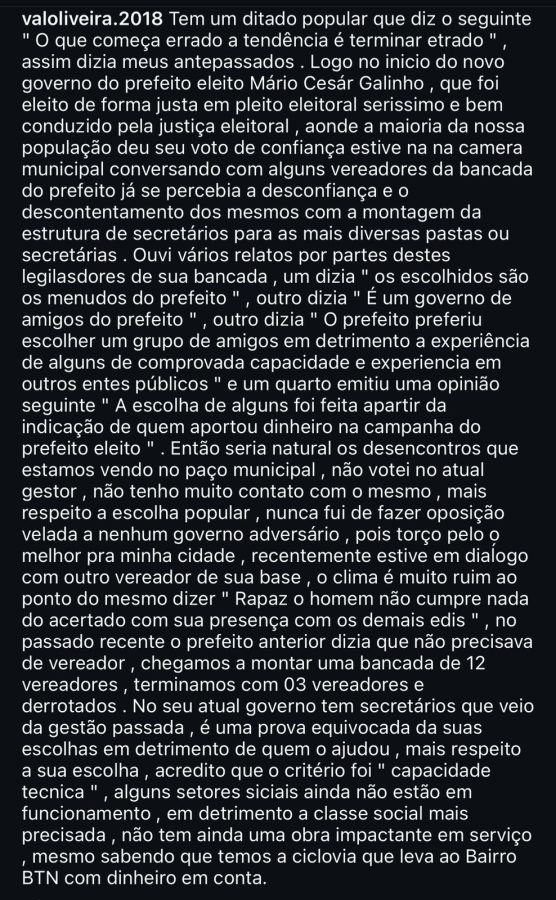 “Val, com todo respeito a sua pessoa, acredito que você, no momento, não tem moral pra falar de gestão […] “foi indicado a um cargo de articulação criado pra lhe dar dinheiro, depois vc foi o pior que já esteve na secretaria de eventos, por último tiraram vc e jogaram em outra secretaria que não saiu do lugar”. “Galinho está no caminho certo e só está insatisfeito com ele quem perdeu a mamata, galinho reeleito e em seguida será o nosso deputado estadual…”
