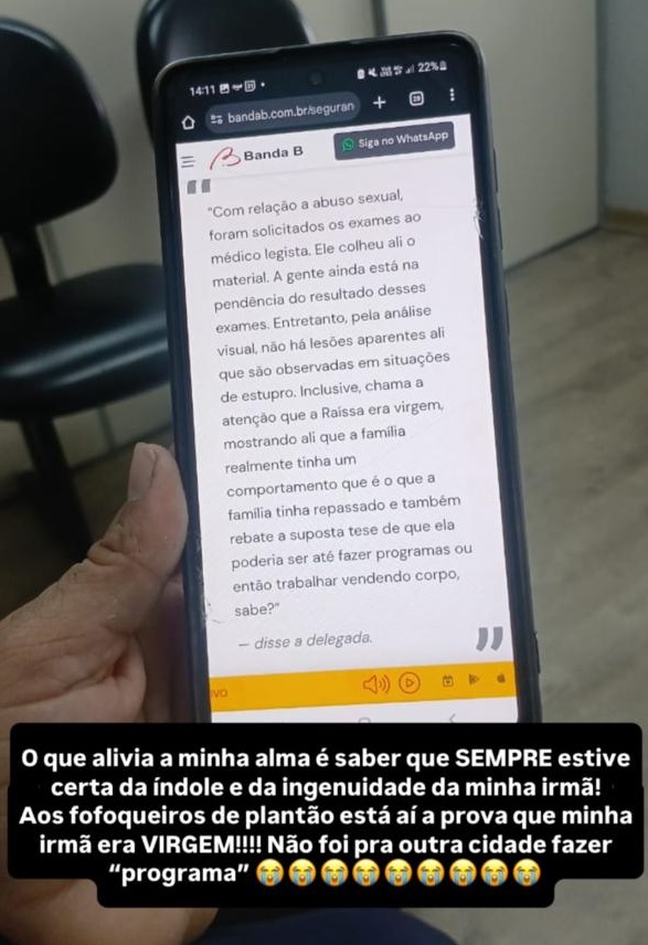 Ainda segundo a delegada, os exames de perícia até o momento não indicam sinais de violência sexual. Um detalhe revelado pelos peritos reforçou a versão da família sobre o comportamento de Raíssa. “Inclusive, chama a atenção que a Raíssa era virgem, mostrando ali que a família realmente tinha um comportamento que é o que a família tinha repassado e também rebate a suposta tese de que ela poderia estar fazendo programas ou trabalhando vendendo o corpo”, afirmou Manzatto.