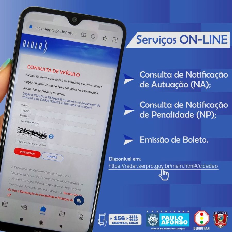 Para emissão de Notificação de Autuação (NA), Notificação de Penalidade (NP) e emissão de boleto, o proprietário do veículo precisa acessar site https://radar.serpro.gov.br/main.html#/cidadao e preencher formulário eletrônico com placa, renavam e caracteres especiais.