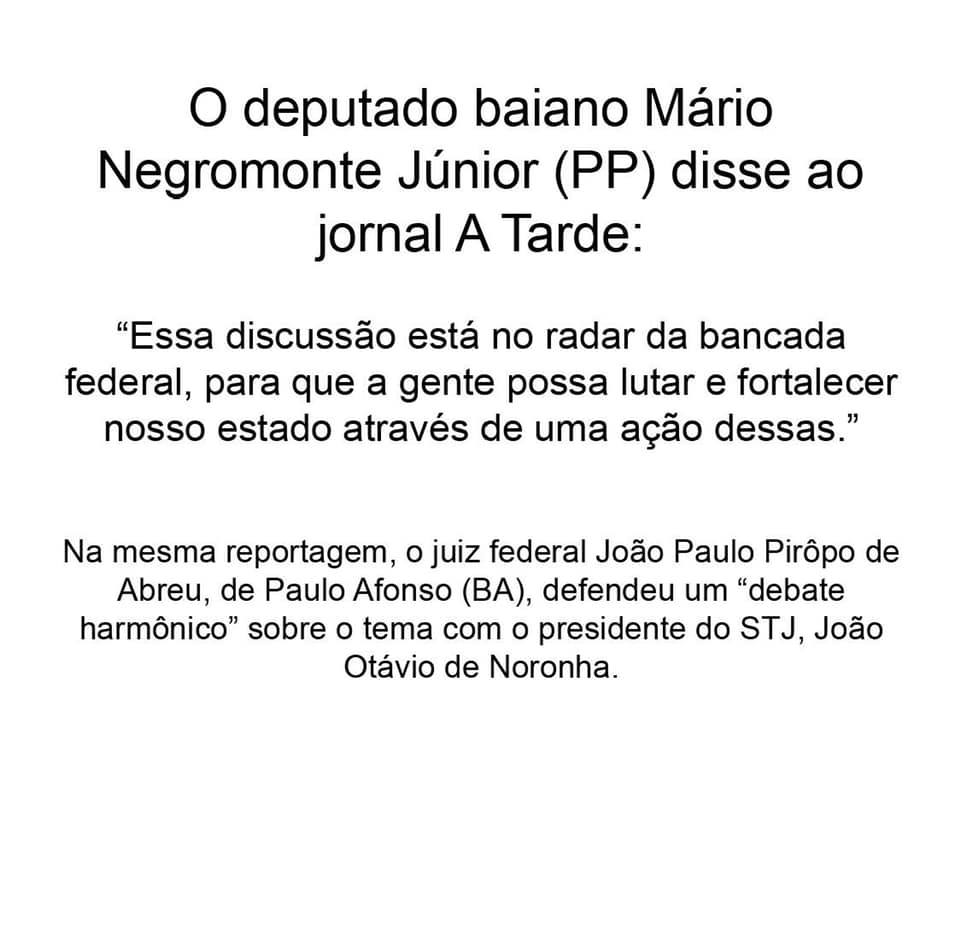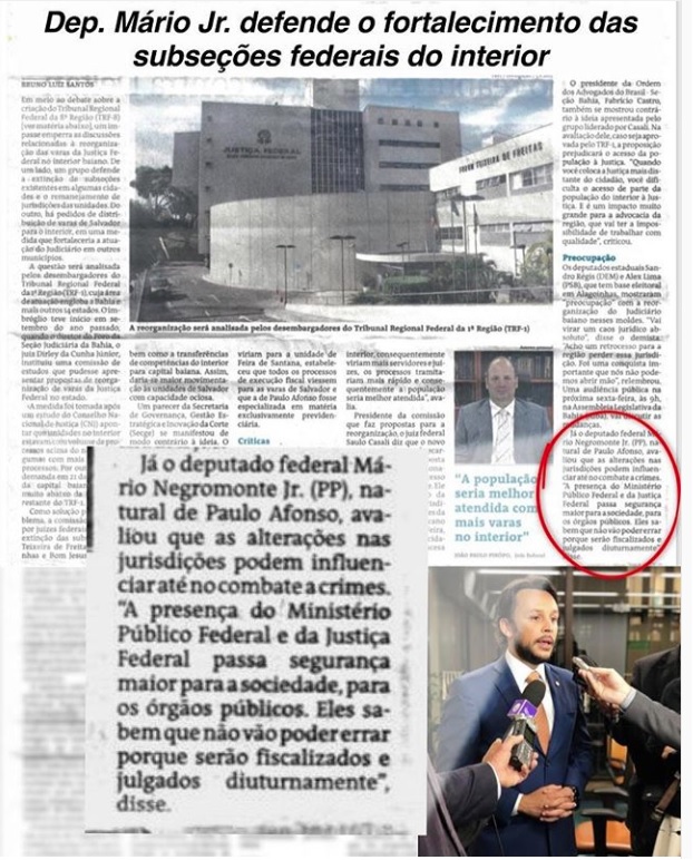 Em reportagem veiculada no jornal A Tarde da Bahia, o deputado federal, Mário Negromonte Júnior (PP), defendeu a reestruturação da Justiça Federal da Bahia com o fortalecimento das Subseções Federais do interior, incluindo as de Paulo Afonso e Alagoinhas.