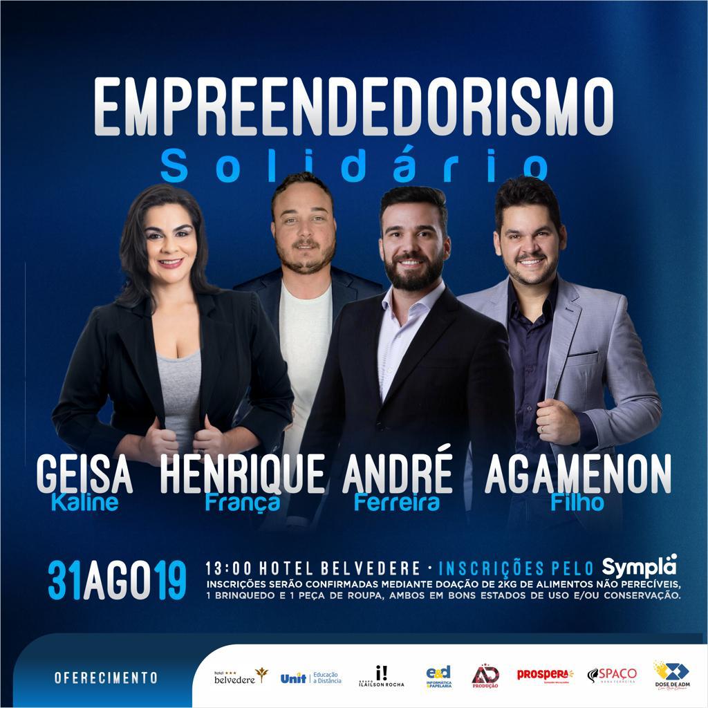 No próximo dia 31 de agosto, às 13 horas, no auditório do Hotel Belvedere, acontecerá em Paulo Afonso/BA o evento “Empreendedorismo Solidário”, que contará com as palestras de Agamenon Filho, Geisa Kaline, André Ferreira e Henrique França.