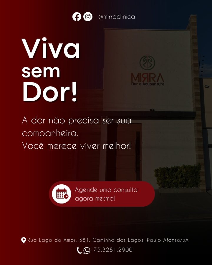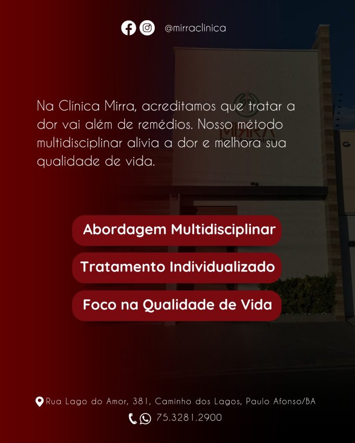 Você sofre com dores persistentes que afetam sua rotina? A dor crônica não precisa ser um peso na sua vida! Com o tratamento multidisciplinar da Clínica Mirra, é possível aliviar a dor, recuperar sua mobilidade e viver com mais qualidade.