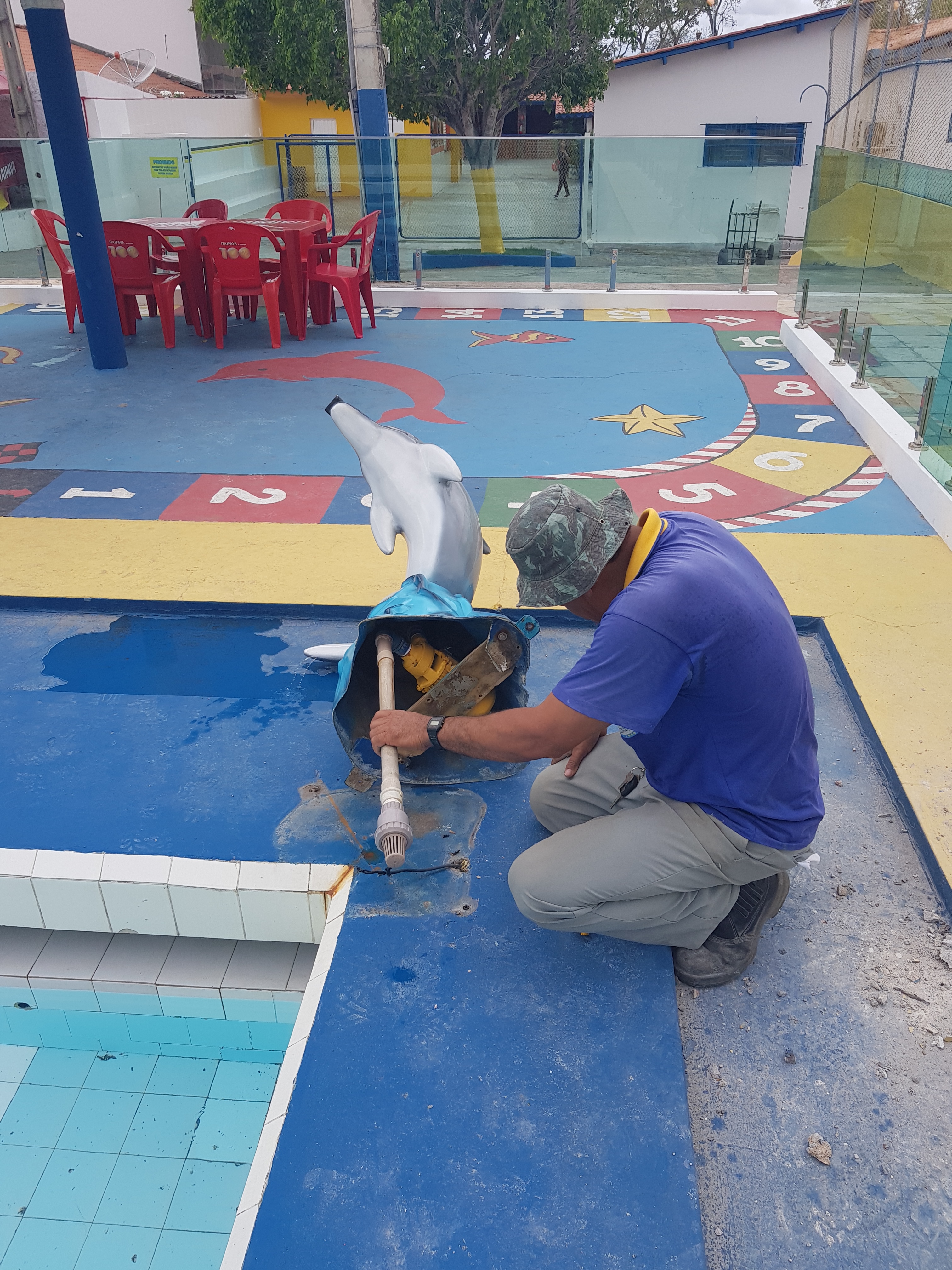 Depois de muito tempo parado sem funcionar e com riscos para as crianças a Diretoria da Gestão 2018/2020 fez a alegria da criançada, realizando manutenção corretiva no golfinho da piscina das Crianças, que além de voltar a funcionar, agora com segurança, pois toda a instalação elétrica e a bomba d´água foi deslocada para área externa da piscina, evitando contato das crianças com a mesma.