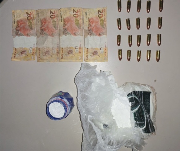 Dentro da bolsa, foram encontradas substâncias aparentando ser cocaína. Durante a abordagem, o suspeito quebrou o próprio celular ao jogá-lo no chão. Questionado sobre a existência de armas, o indivíduo informou que havia apenas munições em sua residência. Os policiais se dirigiram ao local e encontraram 20 cartuchos de pistola calibre 9mm, de uso restrito.